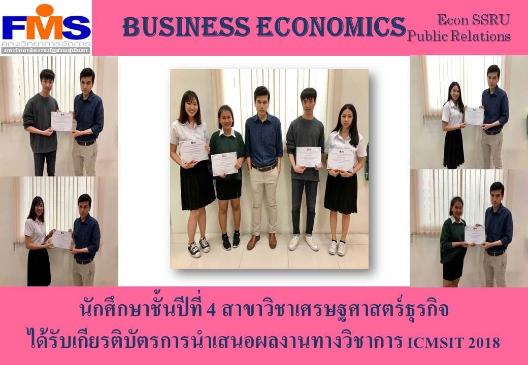 วันที่ 2 ตุลาคม 2561 อ.ดร.ยุทธภูมิ ธนากิจบริสุทธิ์ ได้มอบเกียรติบัตรและร่วมถ่ายภาพกับนักศึกษาชั้นปีที่ 4 คือ นายพุฒิพงษ์ ศิริรัตน์ นางสาวปาริฉัตร ขันทมาตร นางสาวเพชรรัตน์ แซ่โล้ และ นางสาวยุภา เครือช้าง ซึ่งได้เข้าร่วมการนำเสนอบทความวิจัยในโครงการเสนอผลงานวิจัยระดับชาติและนานาชาติ ICMSIT 2018 ที่จัดขึ้นในวันที่ 15 มิถุนายน 2561 ณ คณะวิทยาการจัดการ มหาวิทยาลัยราชภัฏสวนสุนันทา