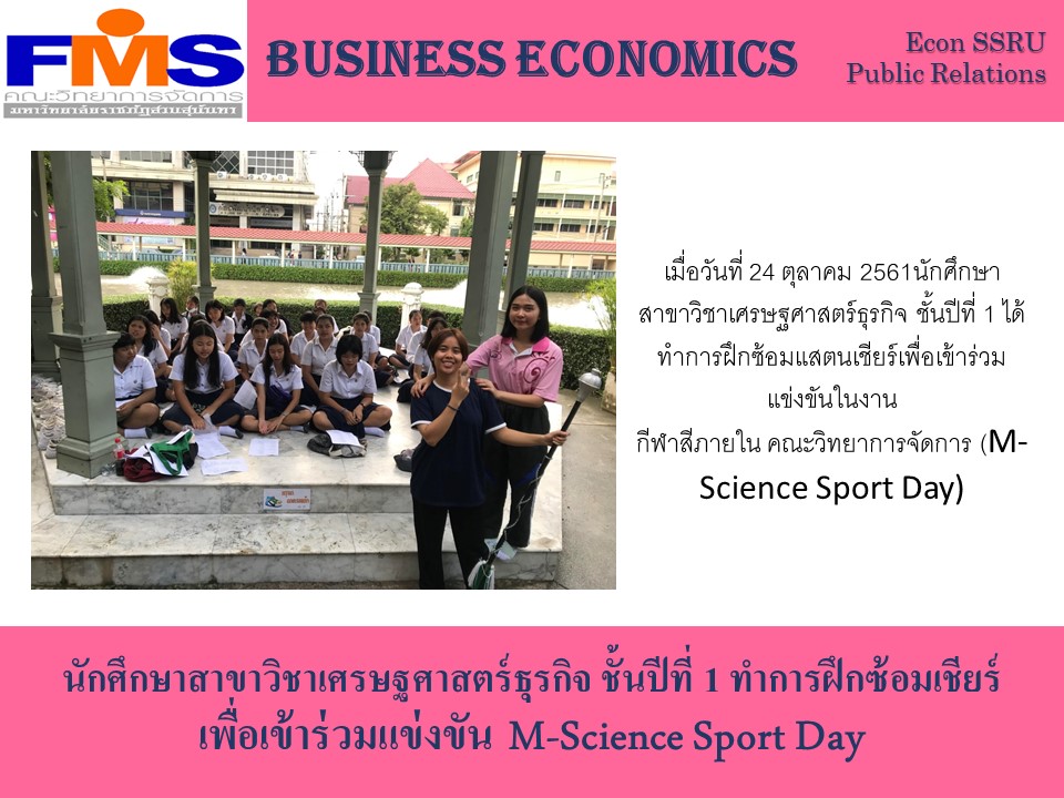 เมื่อวันที่ 24 ตุลาคม 2561นักศึกษาสาขาวิชาเศรษฐศาสตร์ธุรกิจ ชั้นปีที่ 1 ได้ทำการฝึกซ้อมแสตนเชียร์เพื่อเข้าร่วมแข่งขันในงานกีฬาสีภายใน คณะวิทยาการจัดการ (M-Science Sport Day)