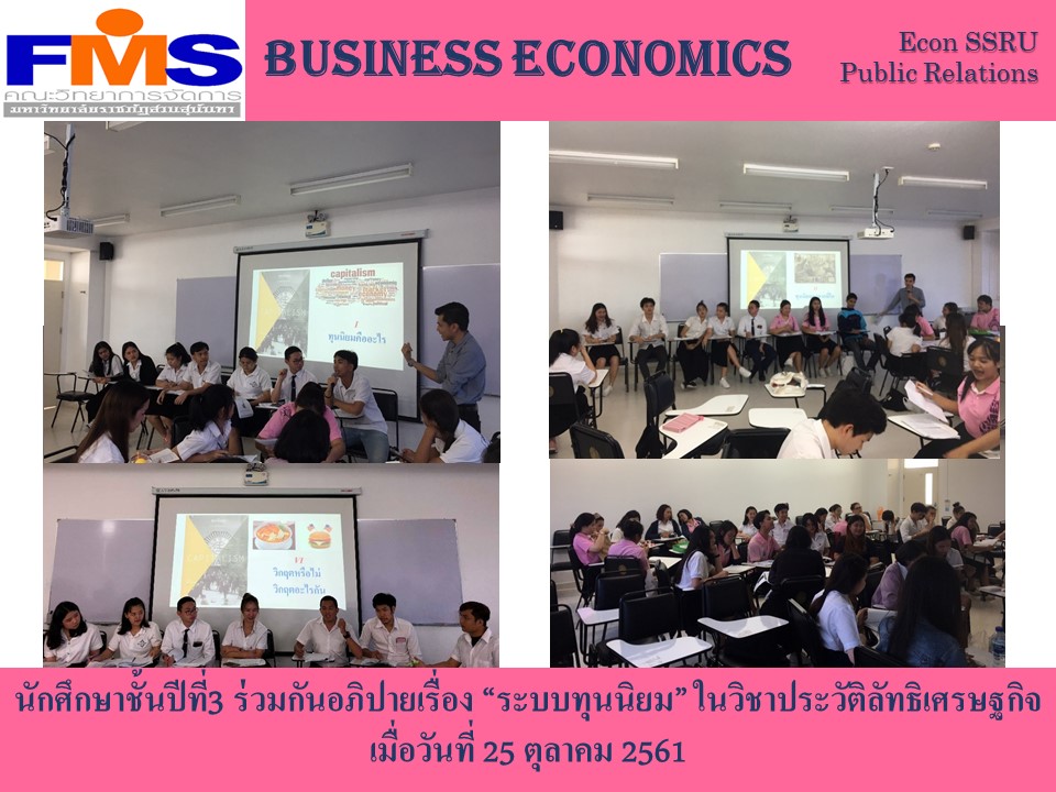 เมื่อวันที่ 25 ตุลาคม 2561 นักศึกษาชั้นปีที่3 สาขาเศรษฐศาสตร์ธุรกิจ ร่วมกันอภิปายเรื่อง “ระบบทุนนิยม” ในวิชาประวัติลัทธิเศรษฐกิจ ซึ่งได้แบ่งกลุ่มและแต่ละกลุ่มส่งตัวแทนมาแลกเปลี่ยนความรู้และถกปัญหาต่างๆ ในเรื่องของระบบทุนนิยม กับประเด็นต่างๆ เช่น ทุนนิยมคืออะไร มีต้นกำเนิดจากที่ไหน ทุนนิยมทุกที่เหมือนกันหรือแตกกต่างกันอย่างไร ทุนนิยมจะกลายเป็นทุนนิยมระดับโลกหรือไม่ และ ทุนนิยมเอาตัวรอดจากวิกฤตอย่างไร ซึ่งนักศึกษาได้เข้าร่วมและแลกเปลี่ยนความคิดเห็นกันอย่างพร้อมเพียง